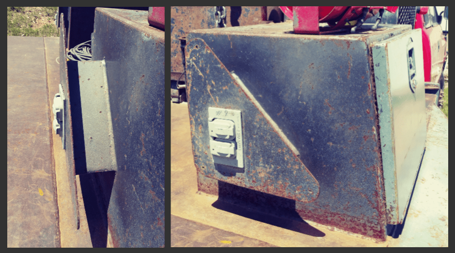 You could place the hoses and leads in tool boxes as well. We have done this in the past before we had the spools in place – just keep in mind that this is more labor intensive and messy. Making a spool is not hard…like the one below that we made, all you really need to make the spool is a piece of plate and a piece of flat bar that is bent into a triangle. We attached this to the side of the toolbox, which works well for our extension cords, but could totally work for hoses and leads if you make them wide enough.